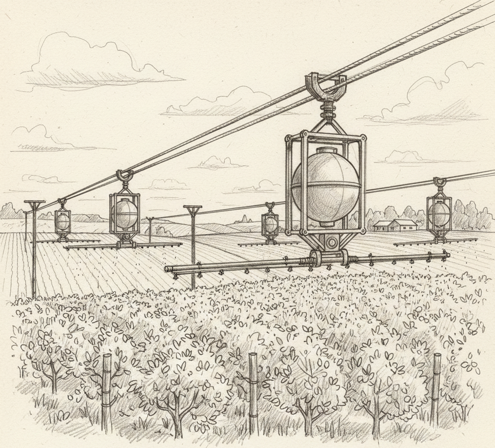 The automated ropeway spraying system is a low-cost, easy-to-install device that drags a small spray carriage along a lightweight cable (ropeway) strung across a field or along crop rows. The carriage carries a pump, a chemical tank, and a spray boom/nozzle array. It travels automatically along the ropeway, delivering a uniform, metered spray of pesticides while eliminating the need for farmers to carry heavy backpack sprayers – physical strain, and exposure to chemicals.