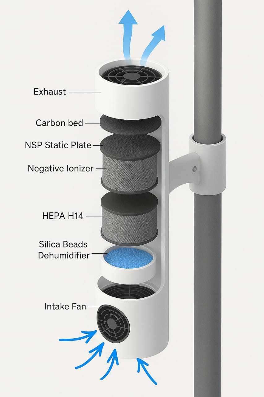 Once fully treated, the purified air exits through the top exhaust fan, completing AirSense’s upward filtration path. The bottom-to-top flow maintains stable pressure and prevents reverse flow during operation.