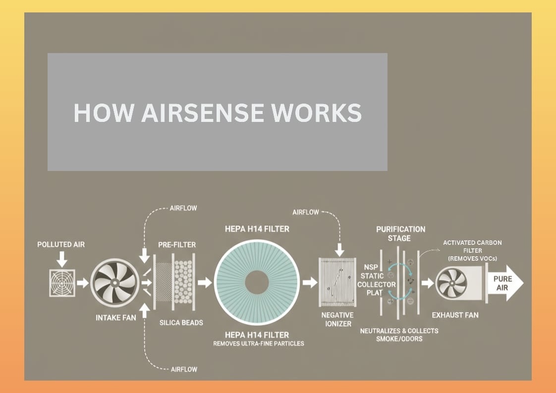 In essence, AirSense weaves together mechanical, electrostatic, and chemical purification into a single clear-bodied, exhibition-ready device — a system that not only cleans air but reveals its own working poetry while doing so.