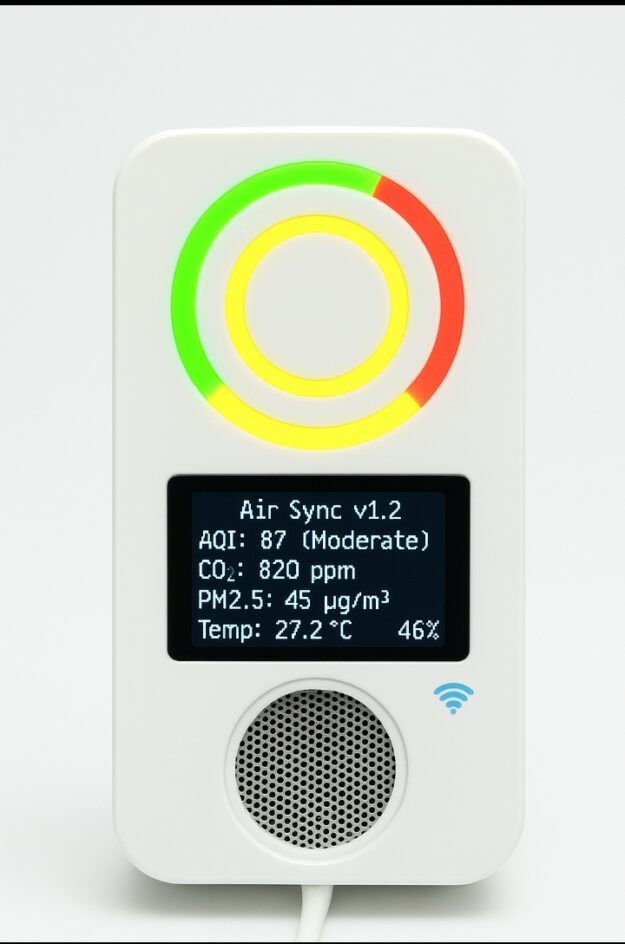 Air Sync is a smart, compact, and affordable air-quality monitoring device designed to make classrooms healthier and safer. It continuously measures AQI, CO₂ levels, PM2.5 particles, temperature, and humidity using high-accuracy sensors and displays the live data on a bright OLED screen.
