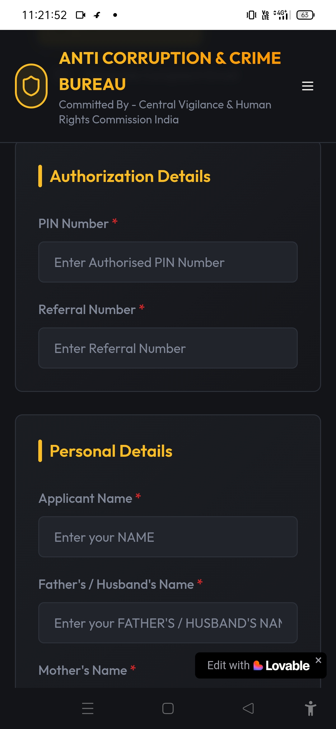 Join the movement to build a corruption-free India with the Anti Corruption App β your secure, digital gateway to justice. Designed with a sleek black theme and backed by the Anti Corruption & Crime Bureau of India, this app empowers every citizen to report wrongdoing with confidence and ease.