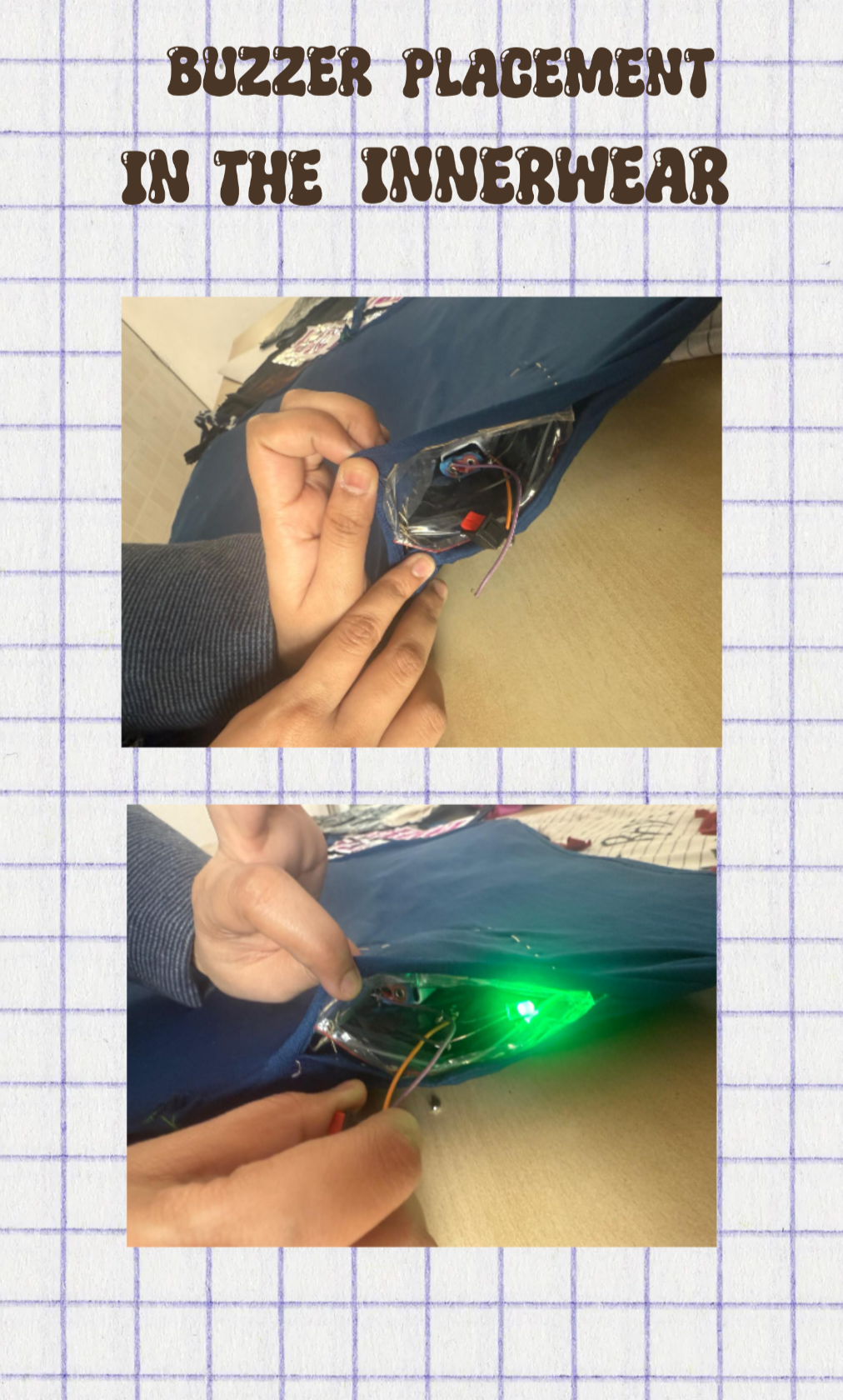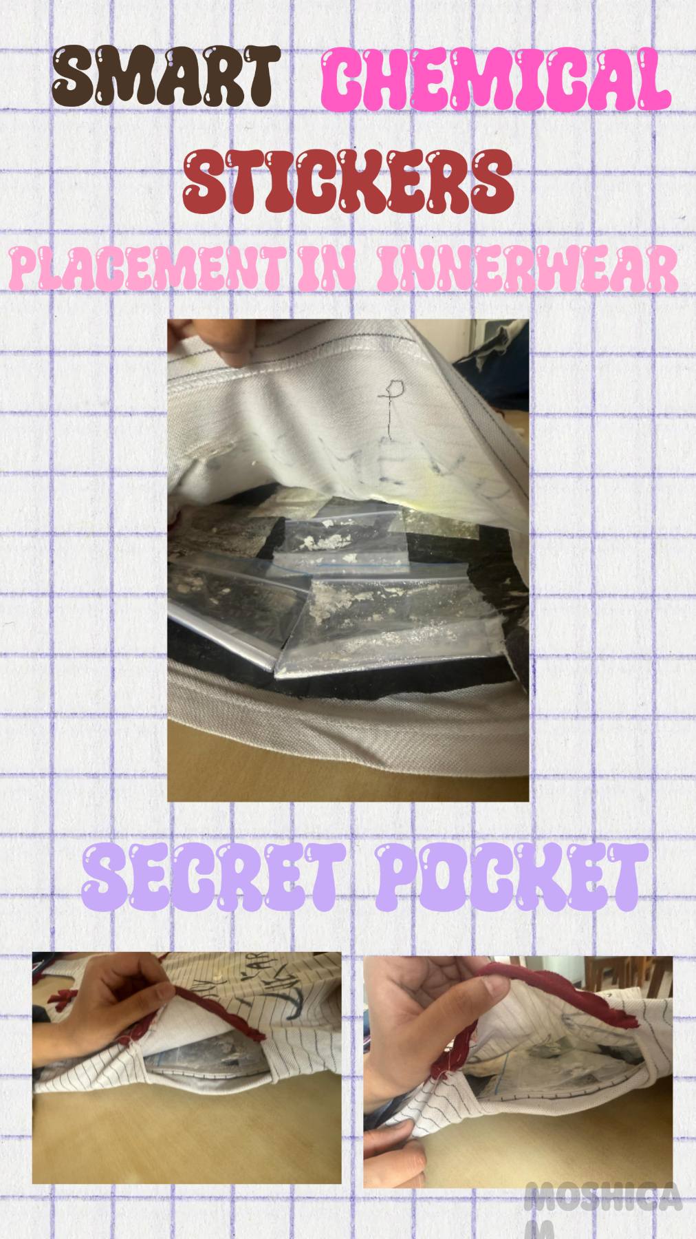 A lightweight, affordable lingerie-style innerwear with smart chemical stickers that cause a burning sensation to deter attackers and a loud buzzer for alerting others—offering women daily confidence, safety, and self-protection.