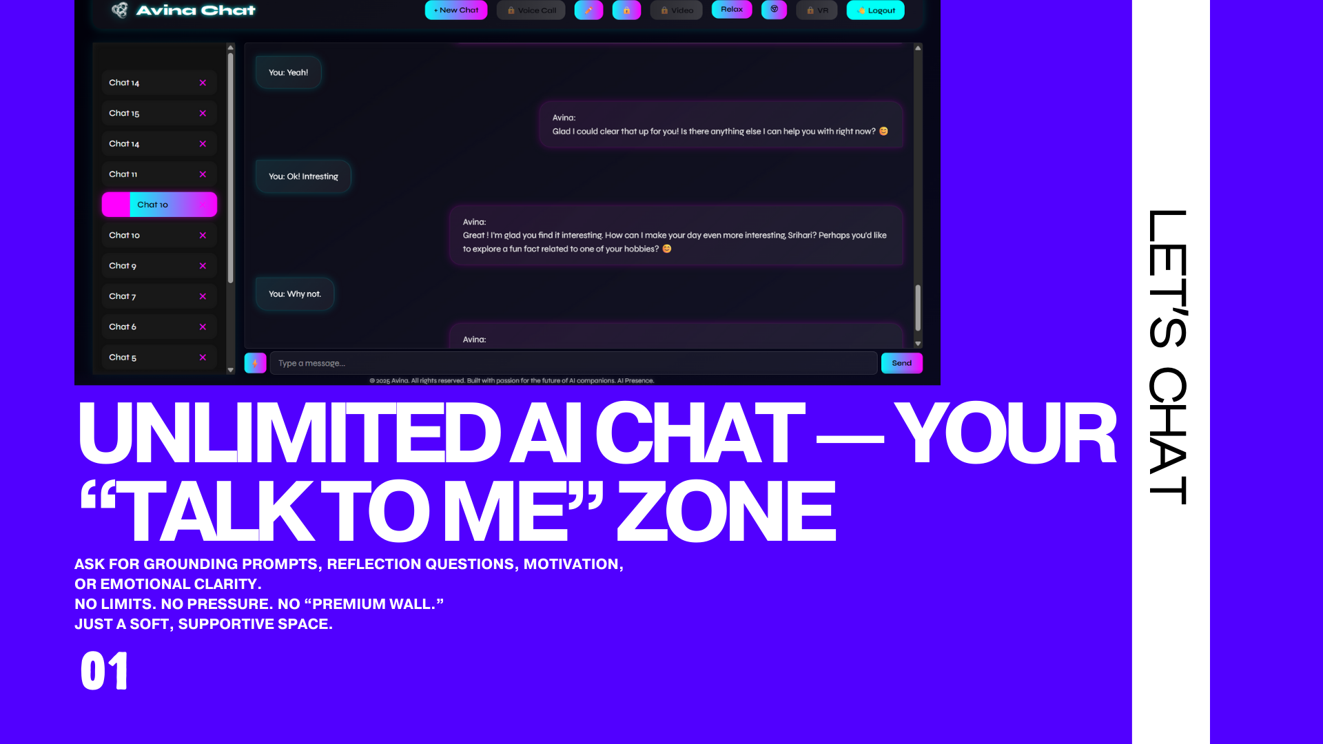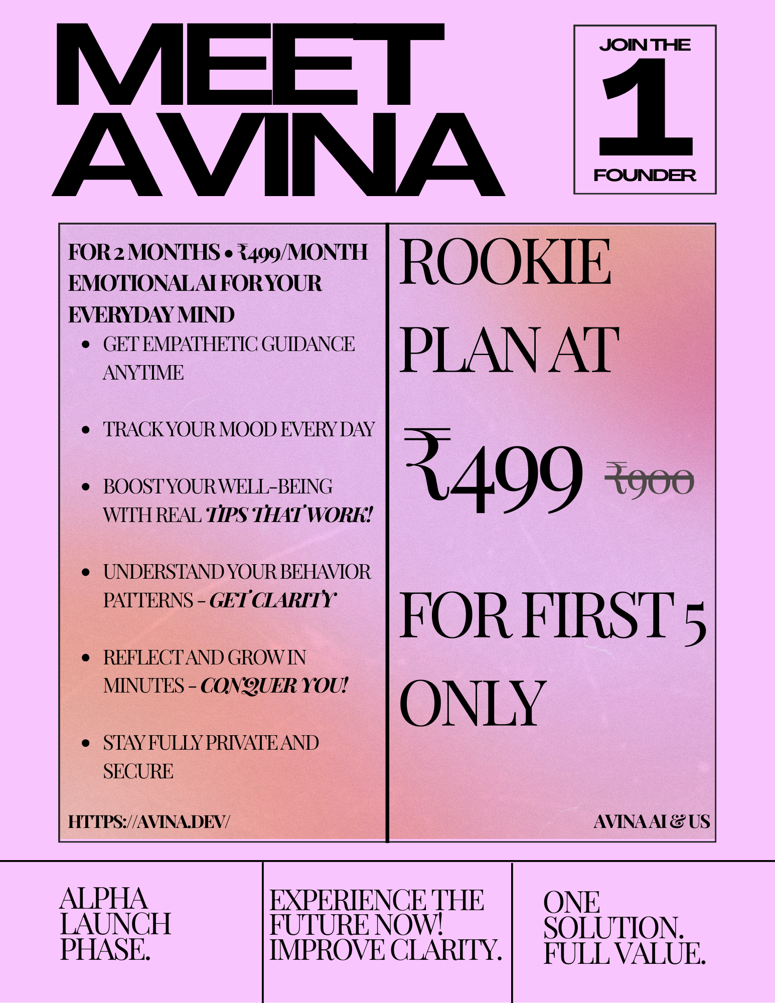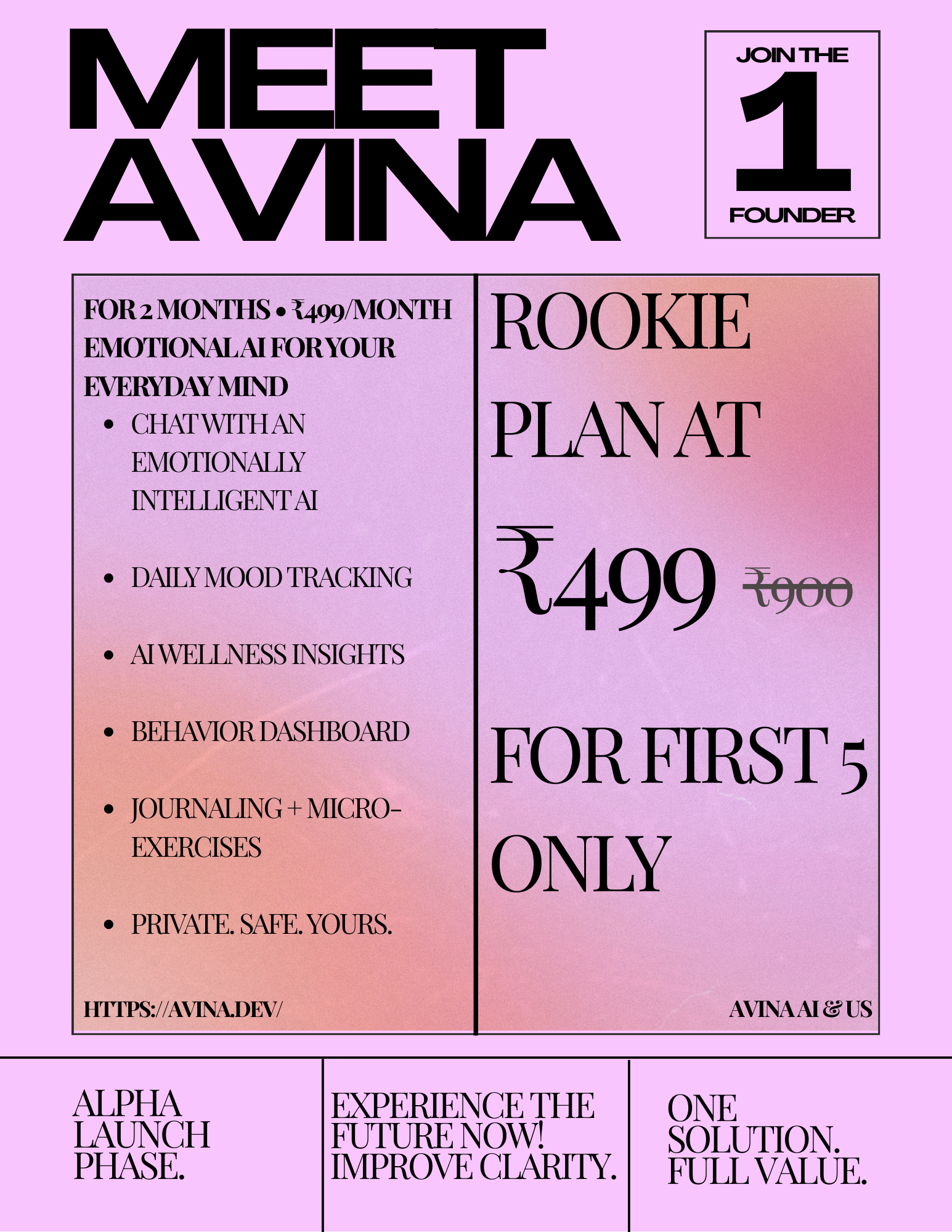 Choosing Avina means you’re not just trying a wellness tool — you’re joining the early evolution of true emotional AI companionship built for real humans, real chaos, real life.