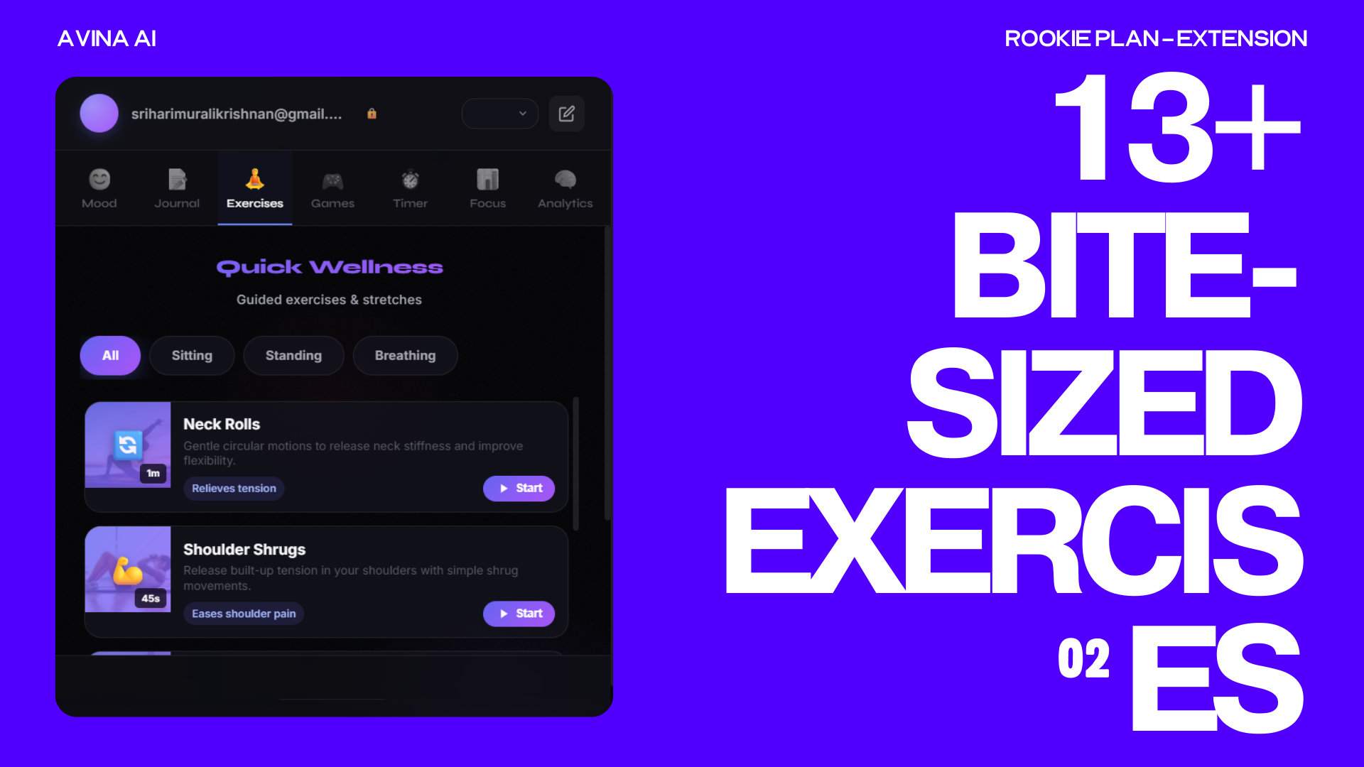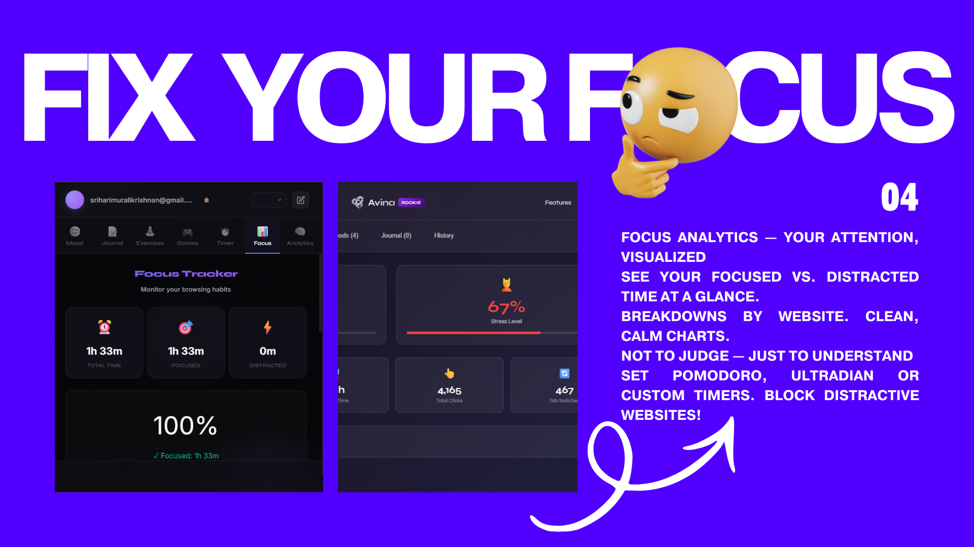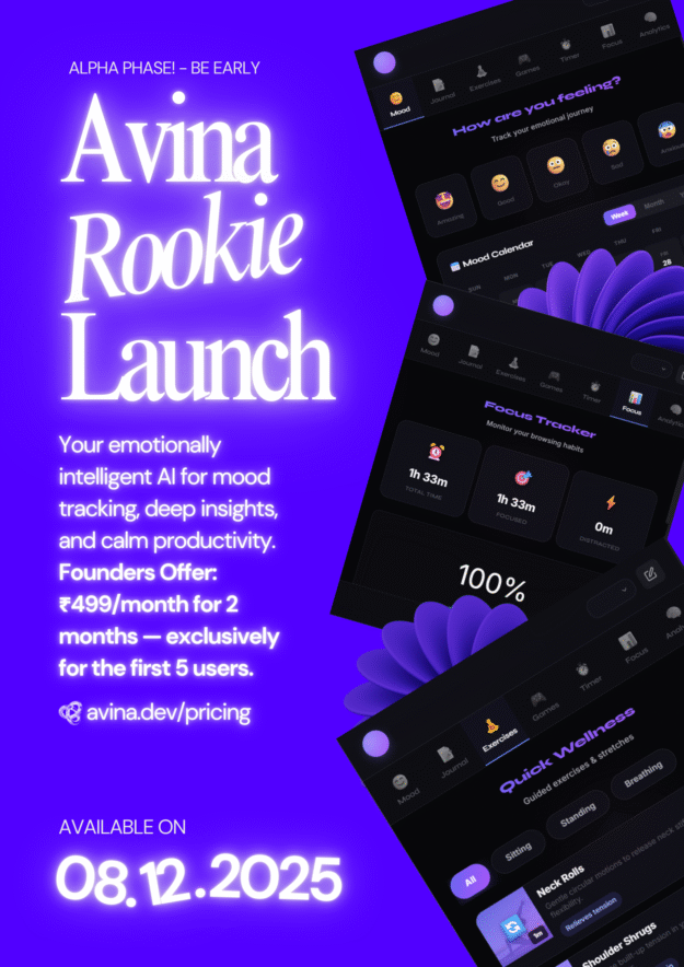 Avina Rookie gives you emotional clarity and focus right inside your browser — no extra apps, no friction. It blends mood tracking, journaling, breathing exercises, focus tools, an emotionally intelligent AI chat, and 50+ behavioural signals into one calm, private companion that supports you as you work, not away from your work. Unlike typical wellness apps that interrupt your flow, Avina stays lightweight, local-first, and always one click away. And behind Rookie, we’re building Avina X-LAB — advanced emotion-aware AI shaping the future of digital wellbeing. With Avina, you’re not just getting a tool — you’re joining the evolution of emotional computing built for real, everyday humans.