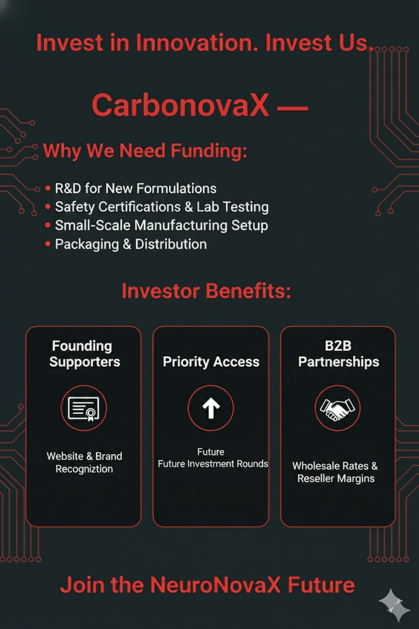 Business owners who become investors will receive privileged access to wholesale rates, exclusive reseller margins, and priority stocking rights. This allows them to build a profitable retail or distribution stream using CarbonovaX products, supported directly by our brand.