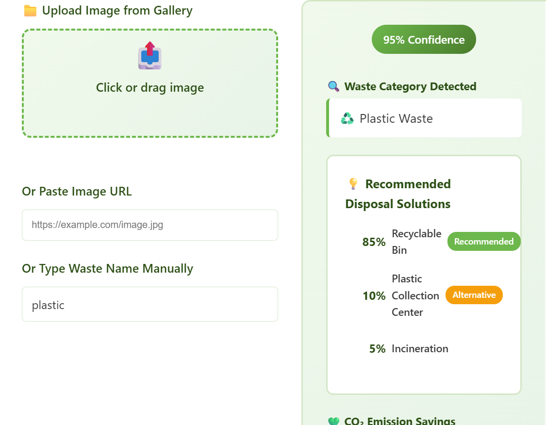 Dispose.AI is an AI-powered web application that instantly classifies waste items via image or text input into categories like recyclable, organic, e-waste, or general trash using neural networks, delivering tailored step-by-step disposal instructions such as rinsing plastics or locating hazardous drop-offs. Its minimalist, mobile-optimized UI with natural colors and educational tips ensures effortless use for students and households, promoting accurate sorting that cuts recycling contamination by up to 40%, reduces landfill waste, and lowers municipal costs. By simplifying sustainability, Dispose.AI fosters eco-habits among youth while showcasing full-stack skills in Python/ML, HTML/JS/PHP, and SQLite—ideal for portfolios and hackathons.