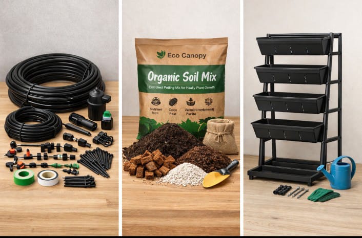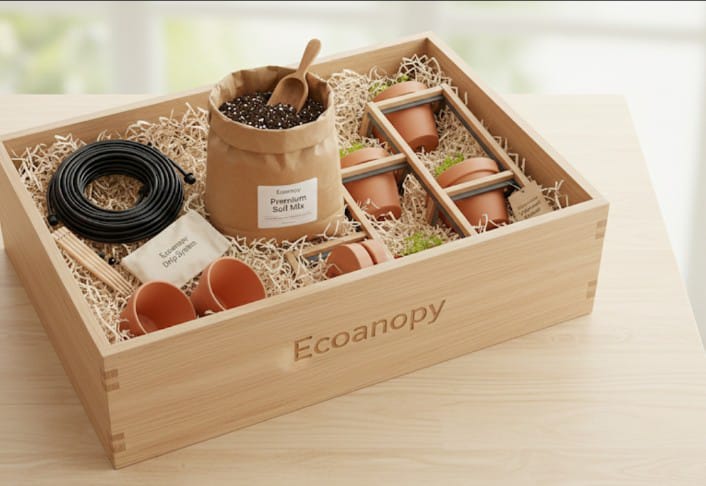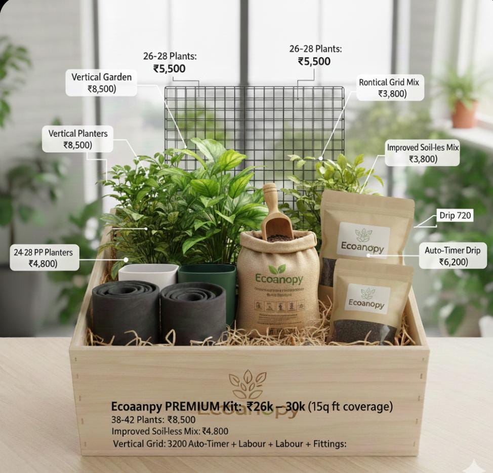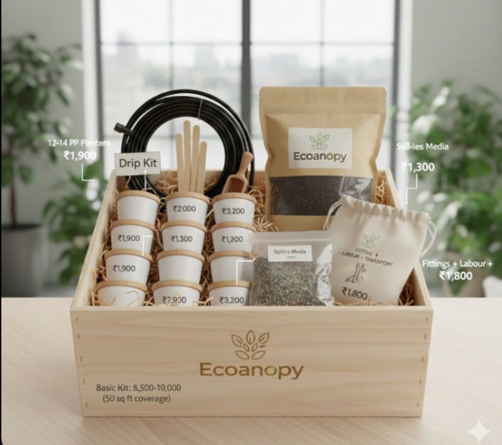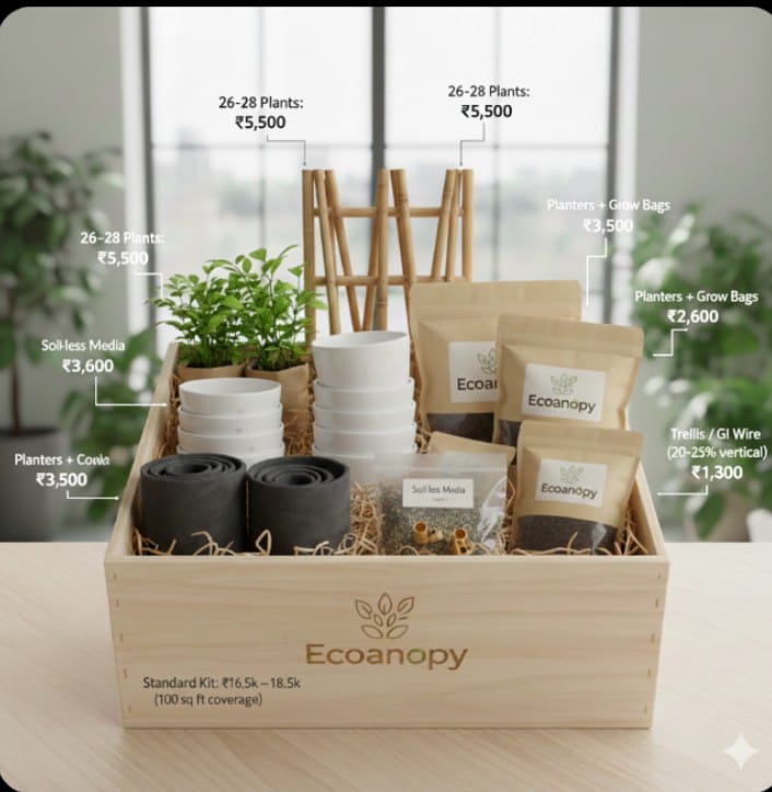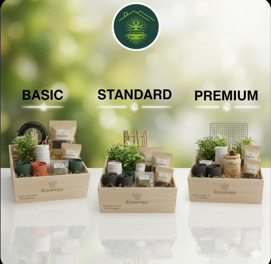 The Ecocanopy kits aims to design, model, and validate a scalable, low-maintenance, modular rooftop afforestation system that maximizes local improvements in air quality (particularly reductions in PM2.5 and NOx exposure) and surface/near-ambient temperature,respects structural, water, and maintenance constraints of typical multi-storey Indian housing and is economically viable for mass adoption. We are not just selling kits we are selling fresh breath for the planet.