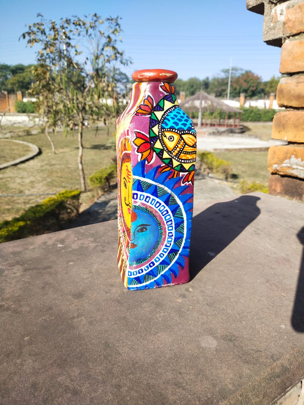 Handcrafted from pure clay, detailed with natural colours, enriched with a plantable seed, and finished with a reflective safety cap — this bottle carries cool water, culture, and a timeless story in every sip.