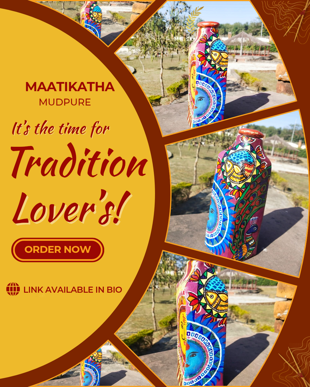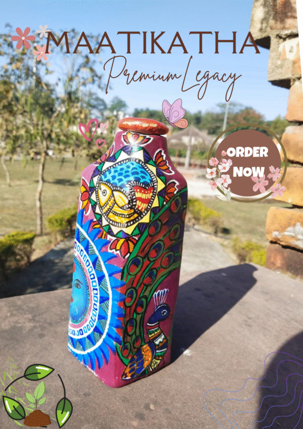 MAATIKATHA by MUDPURE is a premium clay bottle designed to reconnect you with Maati, tradition, and responsible living. Each bottle is made from 100% pure clay, decorated with natural colours, and built to keep your water naturally cool — In a modern, stylish form.