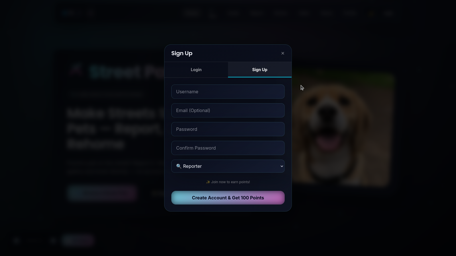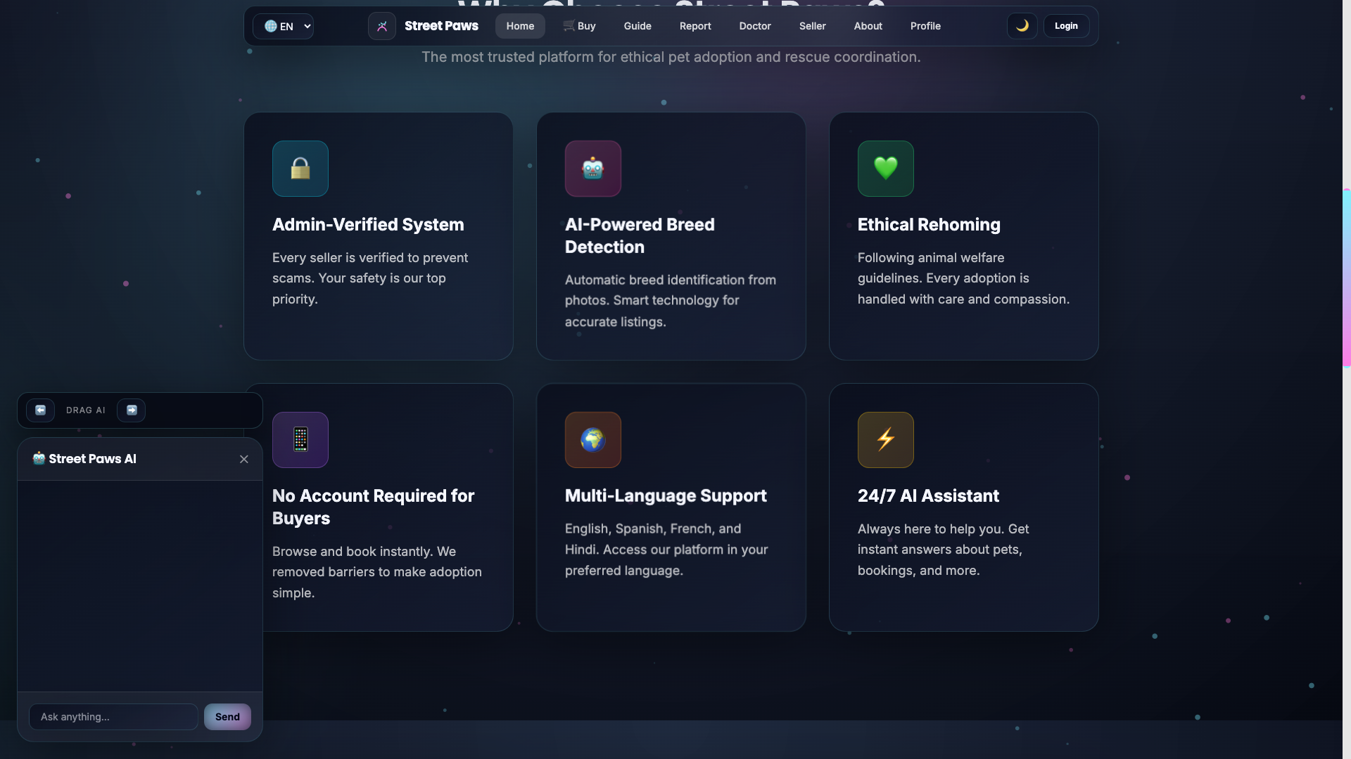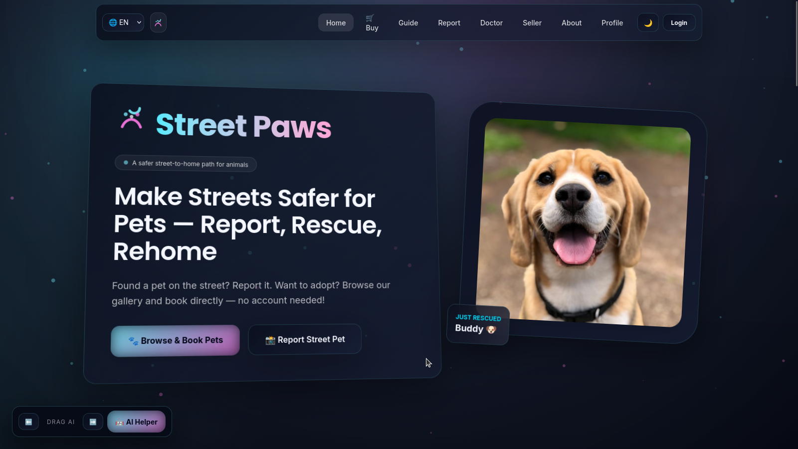 Street Paws is a comprehensive digital pet welfare platform that revolutionizes street animal rescue, pet adoption, and veterinary care through an intuitive, multi-language website featuring glassmorphism design and immersive 3D visual effects. Users can report street animals via email to earn points, veterinarians can register to access reported cases and offer treatment consultations, ethical sellers can list pets with AI-powered breed detection, while buyers can browse a curated pet gallery and book adoptions without creating accounts. The platform includes a 24/7 AI assistant, dark/light theme toggle, admin dashboard for system oversight, multi-language support (EN/ES/FR/HI), real-time statistics, and a robust booking management system, all designed with stunning 3D animations, particle backgrounds, and professional glassmorphism aesthetics that create an engaging, trustworthy environment for animal welfare enthusiasts.