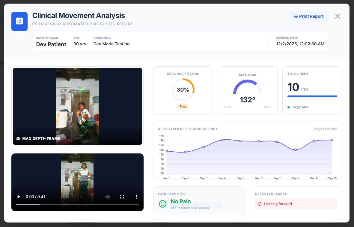Crucially, it lets the doctor watch the actual recording of the session to see exactly how the patient moved. It pairs that footage with key metrics—like accuracy and range of motion—and automatically flags specific mistakes, giving the physio the full picture at a glance.