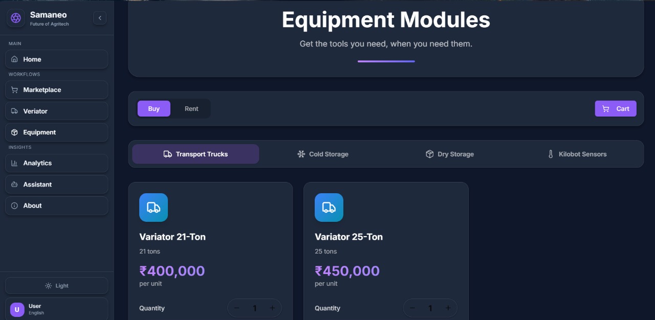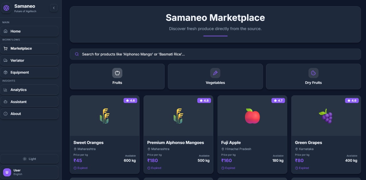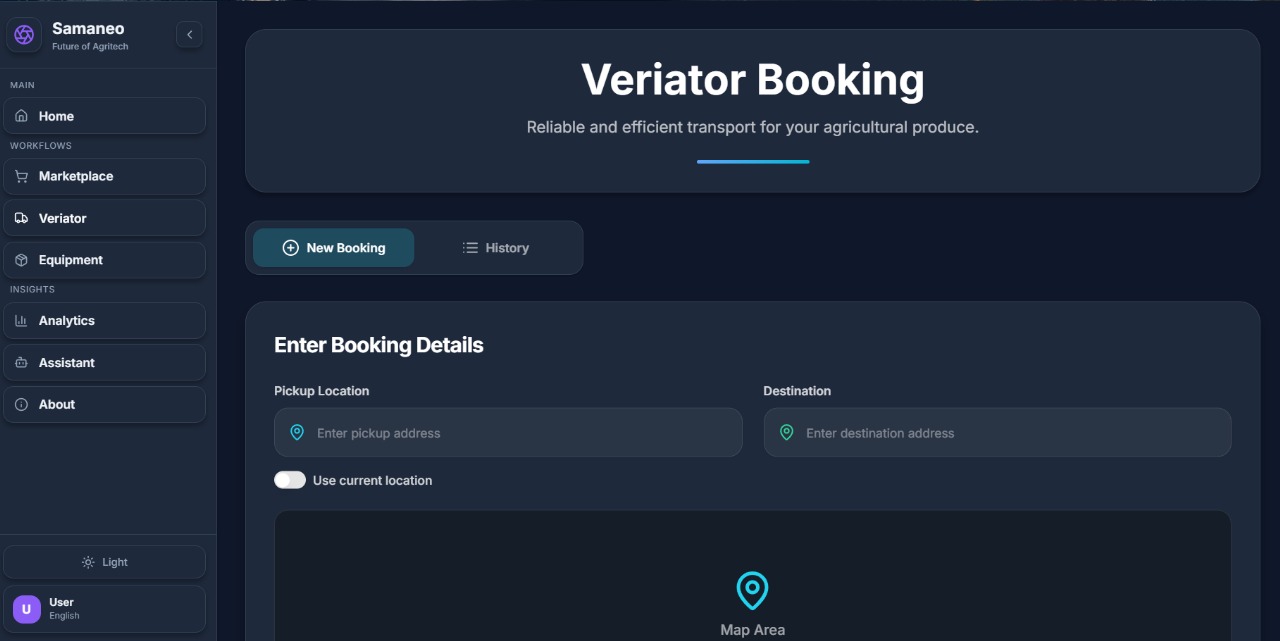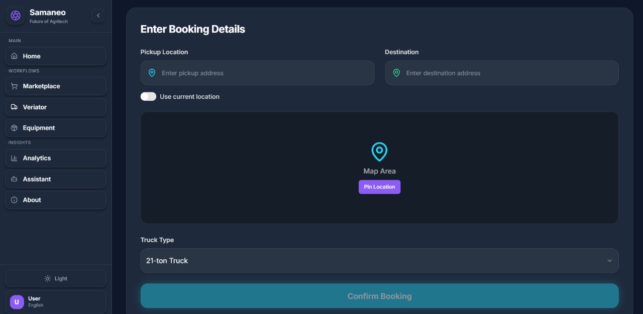 Samaneo is a digital platform where farmers can book Veriator trucks like ride-hailing, sell directly to buyers without middlemen, track orders live, and access AI-powered insights in their local language.