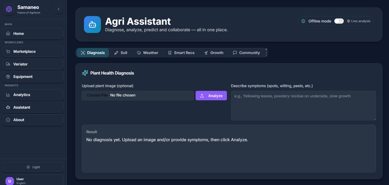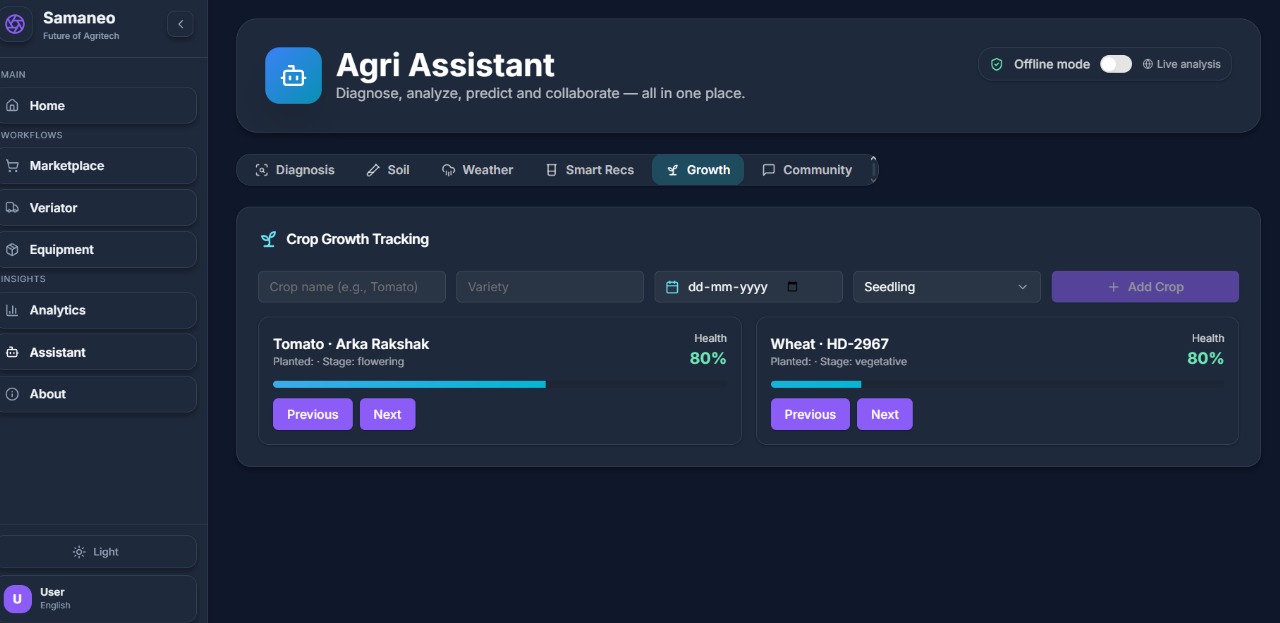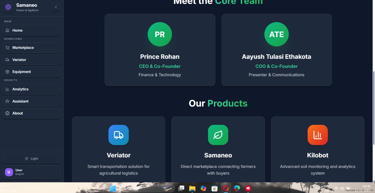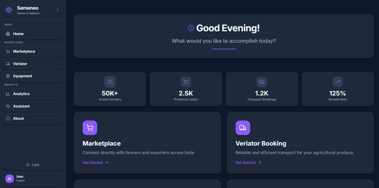 Samaneo is a digital platform where farmers can book Veriator trucks like ride-hailing, sell directly to buyers without middlemen, track orders live, and access AI-powered insights in their local language.