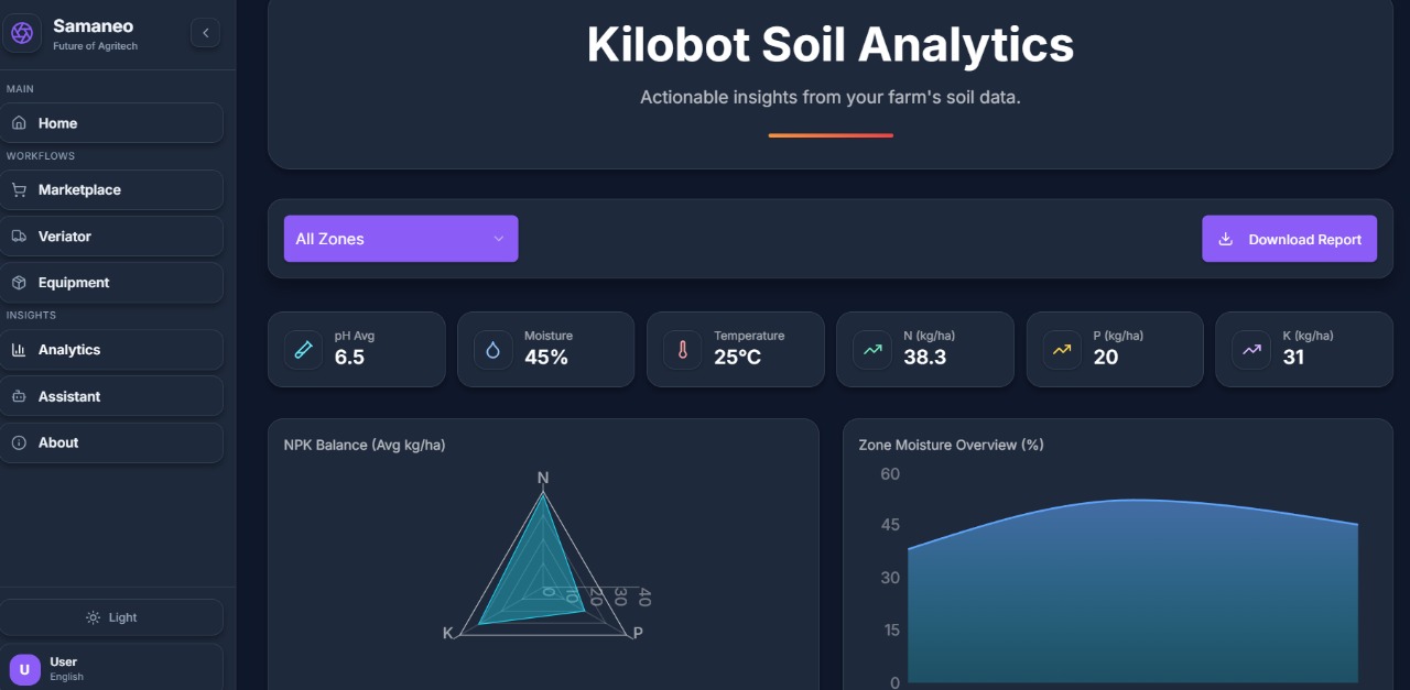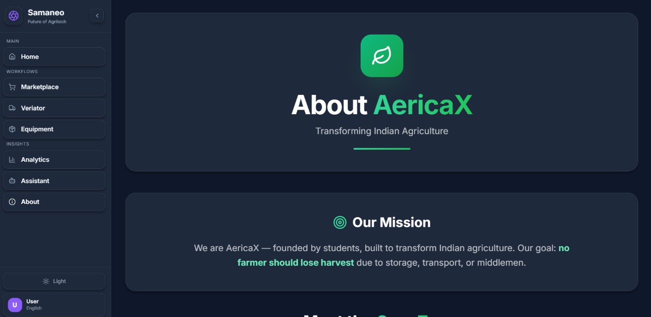 Samaneo is the digital command center of the Aerica X ecosystem. It allows farmers to book cold or dry transport trucks instantly, similar to using a ride-hailing app. Users select the pickup location, choose the type of container, view dynamic pricing, and track the truck in real time. Beyond logistics, Samaneo includes a direct marketplace, enabling farmers to sell produce straight to retailers and exporters without middlemen, keeping up to 70% more profit. The app is available in multiple Indian languages and includes training videos, AI crop suggestions, weather alerts, and seamless integration with KiloBot and Veriator. With a small 3% commission, Samaneo remains affordable while offering farmers complete control over storage, pricing, and transport.