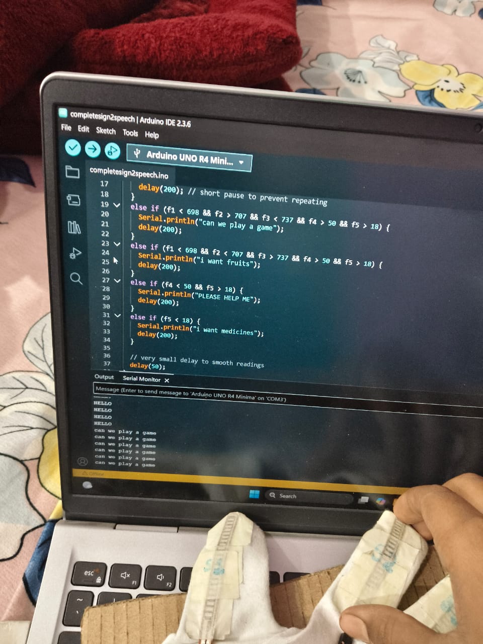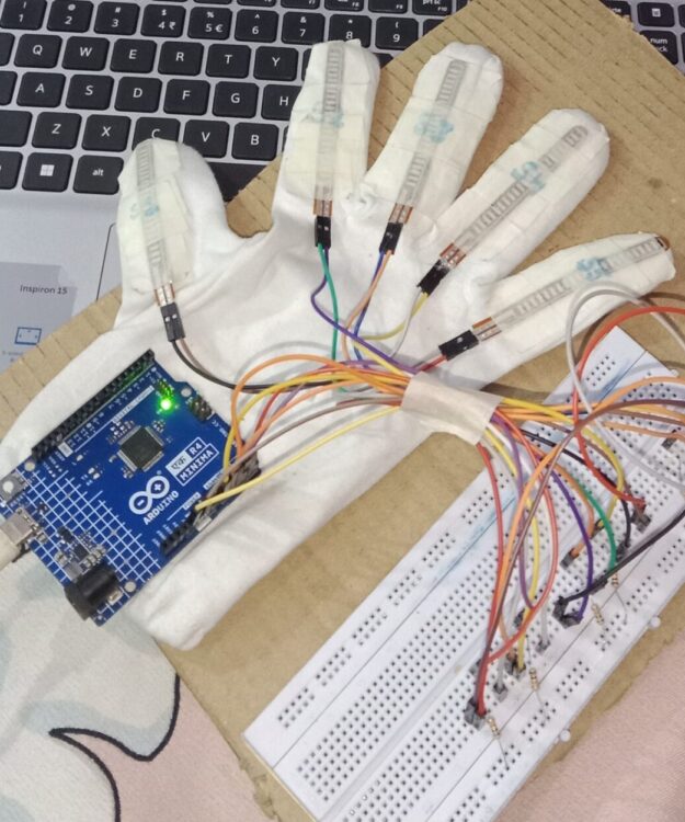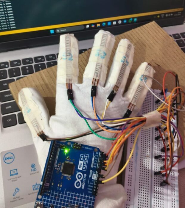 It uses five flex sensors, an Arduino-based brain, and a real-time gesture-detection system to convert sign-language hand movements into text output on a screen. Our prototype is lightweight, portable, and built with accuracy in mind — making communication accessible, fast, and effortless.