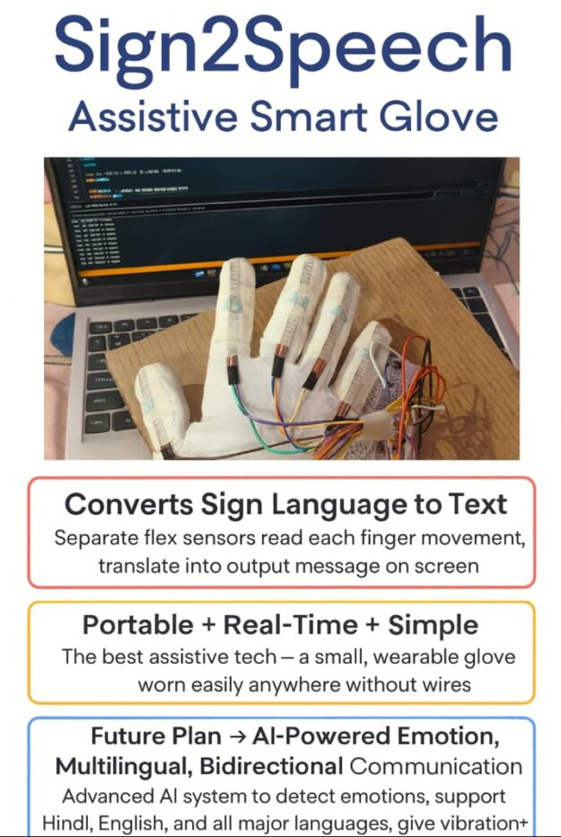 - Sign2Speech Smart Glove – a wearable assistive device that converts hand gestures into text, helping speech- and hearing-impaired users communicate instantly using flex-sensor technology.
