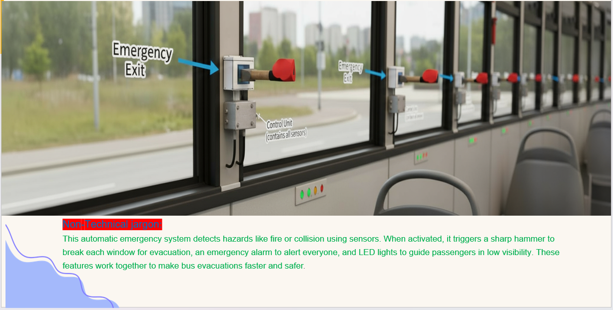 This idea was chosen because it confronts the most urgent and life-threatening issue in Indian bus safety: evacuation delays caused by overcrowding, blocked or inaccessible exits, and panic during emergencies. Unlike other safety measures that depend on passenger awareness or individual action, this system operates automatically and inclusively for all passengers—children, the elderly, and people with disabilities alike. Moreover, it is cost-effective and suitable for retrofitting India’s vast, predominantly older bus fleet, making it an immediately practical and scalable solution.