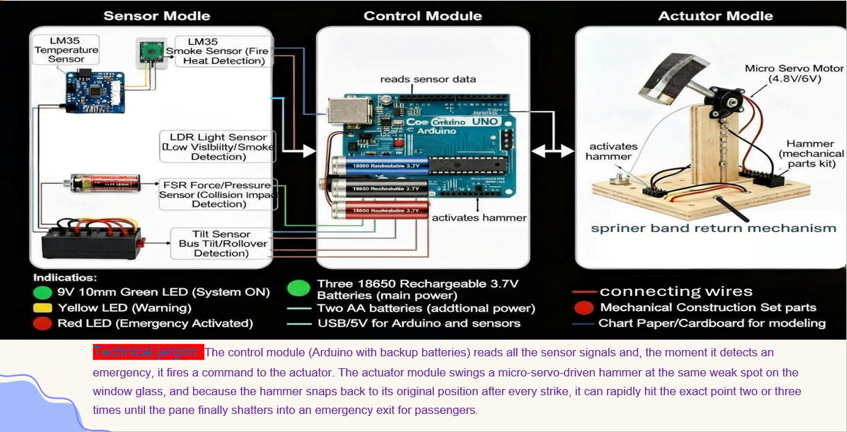 The core concept behind this project is the Automatic Glass-Breaking Emergency Evacuation System for buses. This innovative system automatically shatters designated bus windows when fire, smoke, collision, or other emergencies are detected, instantly creating new exits that empower passengers to escape quickly and safely—saving lives when every second counts. These emergency exits are provided for every window seat, ensuring swift evacuation without congestion, allowing multiple passengers to exit simultaneously and reducing fatal bottlenecks. The importance of this system is underscored by tragic incidents like the Kaveri bus fire in Kurnool in October 2025, where delayed evacuation led to many deaths.