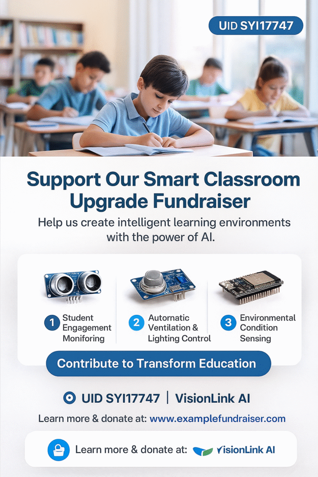 The Smart Classroom Upgrade Fundraiser by VisionLink AI focuses on turning traditional classrooms into intelligent, automated learning spaces.