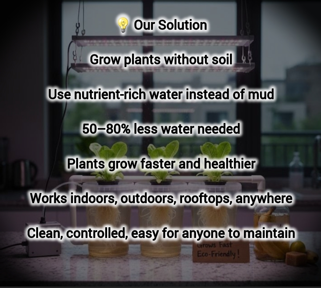 Our Smart Hydroponics model grows plants without soil by circulating nutrient-rich water through trays. A pump lifts the water, it flows past the roots, and returns to the tank, which saves water and keeps the system simple. Nutrients mix directly into the water, and the plants sit in net pots, helping them grow faster and cleaner even in small spaces.