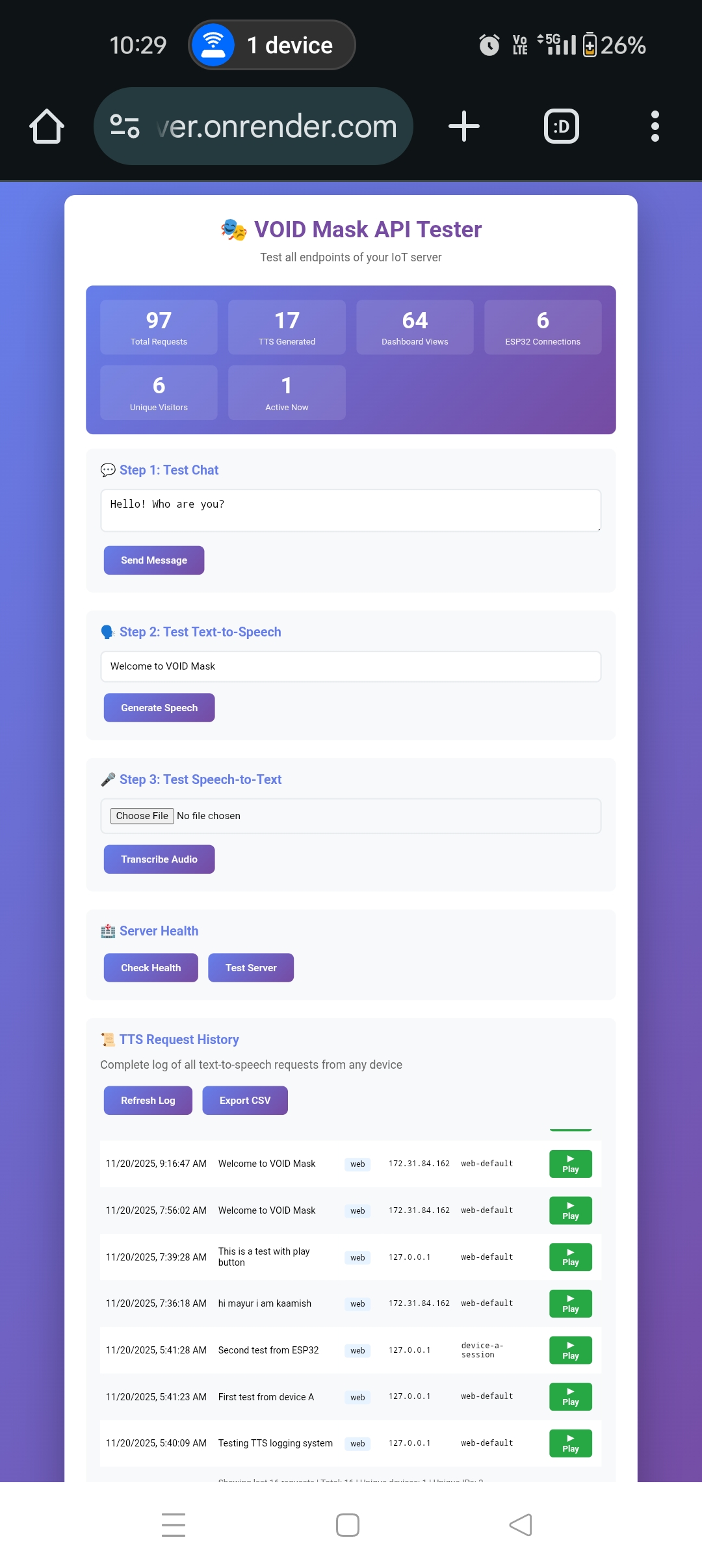 VOID Mask records the user’s speech inside the mask, sends it to a Flask AI server for processing, and plays back clear, amplified speech in real-time.