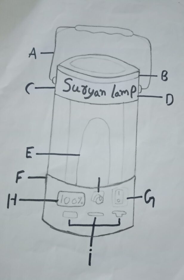 A: handle B: magnetic lead C: heat energy to electricity converter D: Suryan lamp E: eco friendly CFL lamp bulb F: outer body of the lamp bamboo G: ON/OFF switch H: charge percentage display I: output port C/B PIN charging port